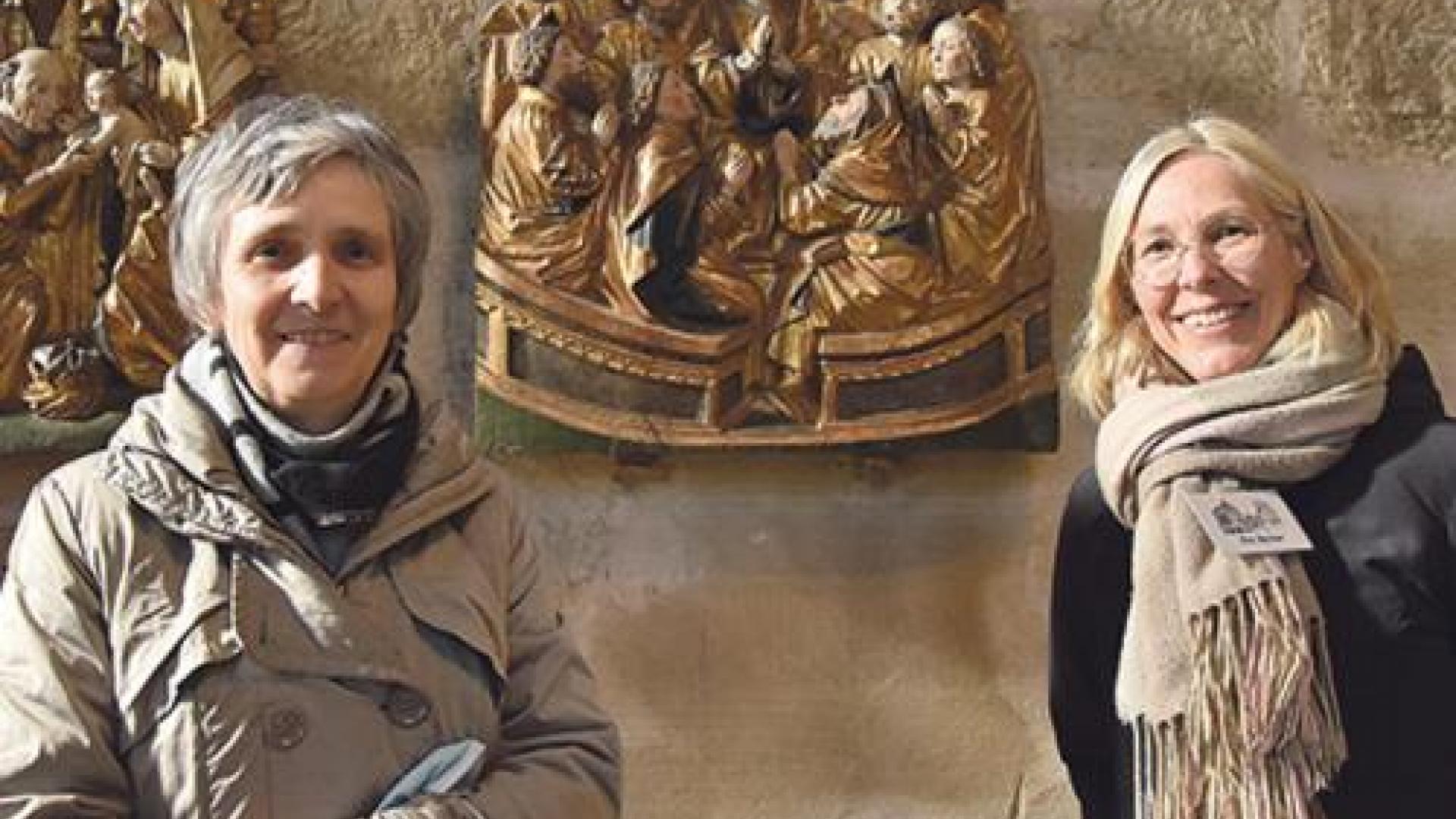 | Cordula Hörbe (links) und Eva Becher vor dem Pfingstrelief im Erfurter Dom. Kinder wundern sich häufig über die „Antennen“, die sie auf dem Kopf der dargestellten Menschen erkannten. Foto: Dorothee Wanzek |