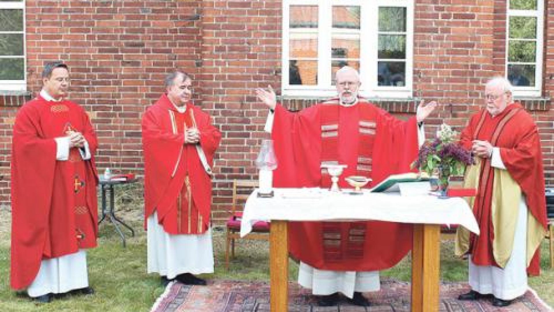 | Dompropst Tobias Przytarski feierte zusammen mit den Pfarrern Christoph Zimmermann, Bernhard Schlosser (links) und Michael Ritschel (rechts) den Gottesdienst im Garten des ehemaligen Pfarrhauses, das Willimsky 1927 errichten ließ. Foto: Oliver Gierens |