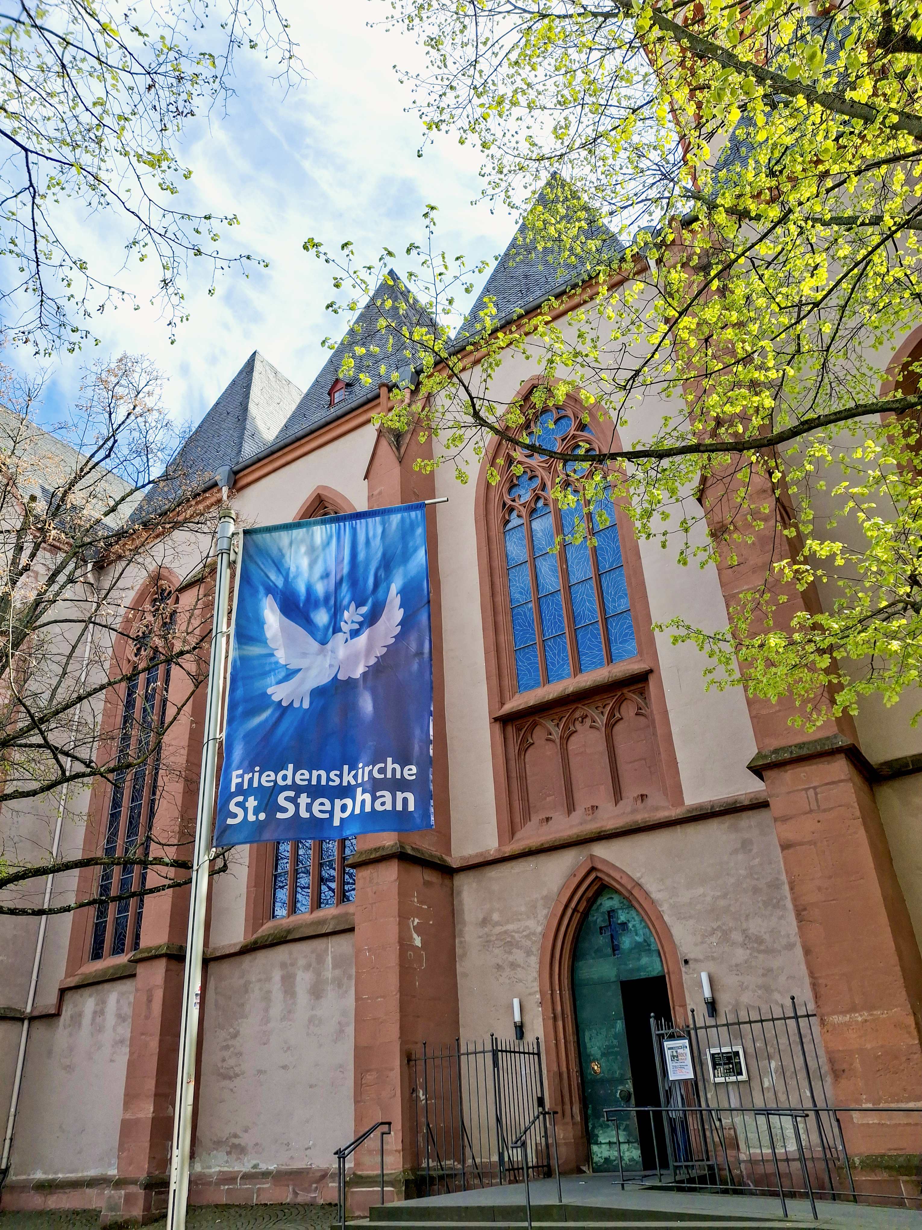 Nicht nur die Fenster von St. Stephan mahnen zum Frieden: Um 990 gründete der heilige Willigis St. Stephan als Stiftskirche. In ihrer Geschichte spielte das Gebet um das Wohl des Landes und damit um den Frieden eine große Rolle. Dies legt auch ein alter Schluss-Stein in der St.-Pankratius-Kapelle im Kreuzgang von St. Stephan nahe. Dessen Inschrift lautet: „Der Friede Gottes sei hier allezeit und allenthalben. Amen.“ Jahrhundertelang beteten die Geistlichen dort für den Frieden. Mit der Aufhebung des Stifts 1803 wurde dieses Gebet der Gemeinde von St. Stephan anvertraut.