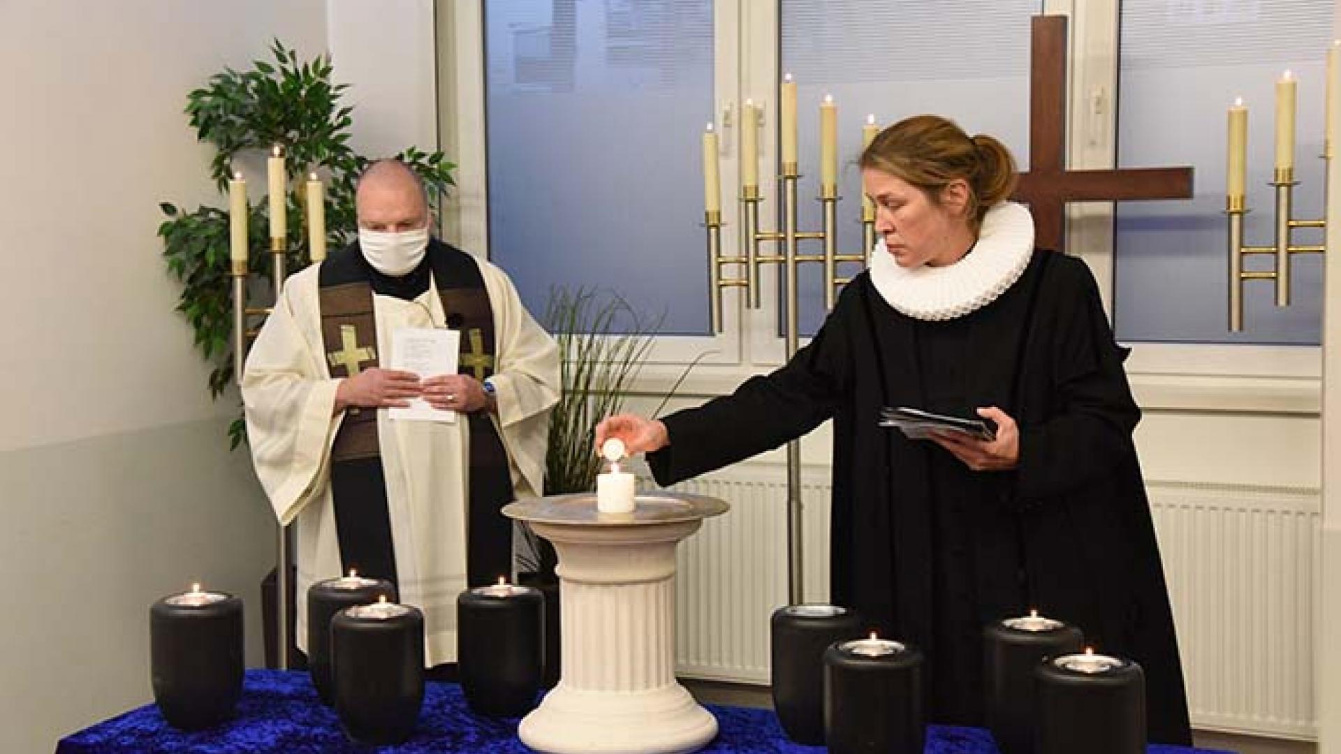 Es hat sich nur eine kleine Trauergemeinde eingefunden: Pastor Peter Otto und Pastorin Inga Meißner (die sich mit zwei ev. Pastoren abwechselt) sehen sich regelmäßig bei diesen ökumenischen Trauerfeiern. Außerdem sind da noch zwei Frauen aus der katholischen Kirchengemeinde Herz Jesu, die ebenfalls oft zu diesen Andachten kommen, sowie drei Medienleute vom Erzbistum Hamburg.