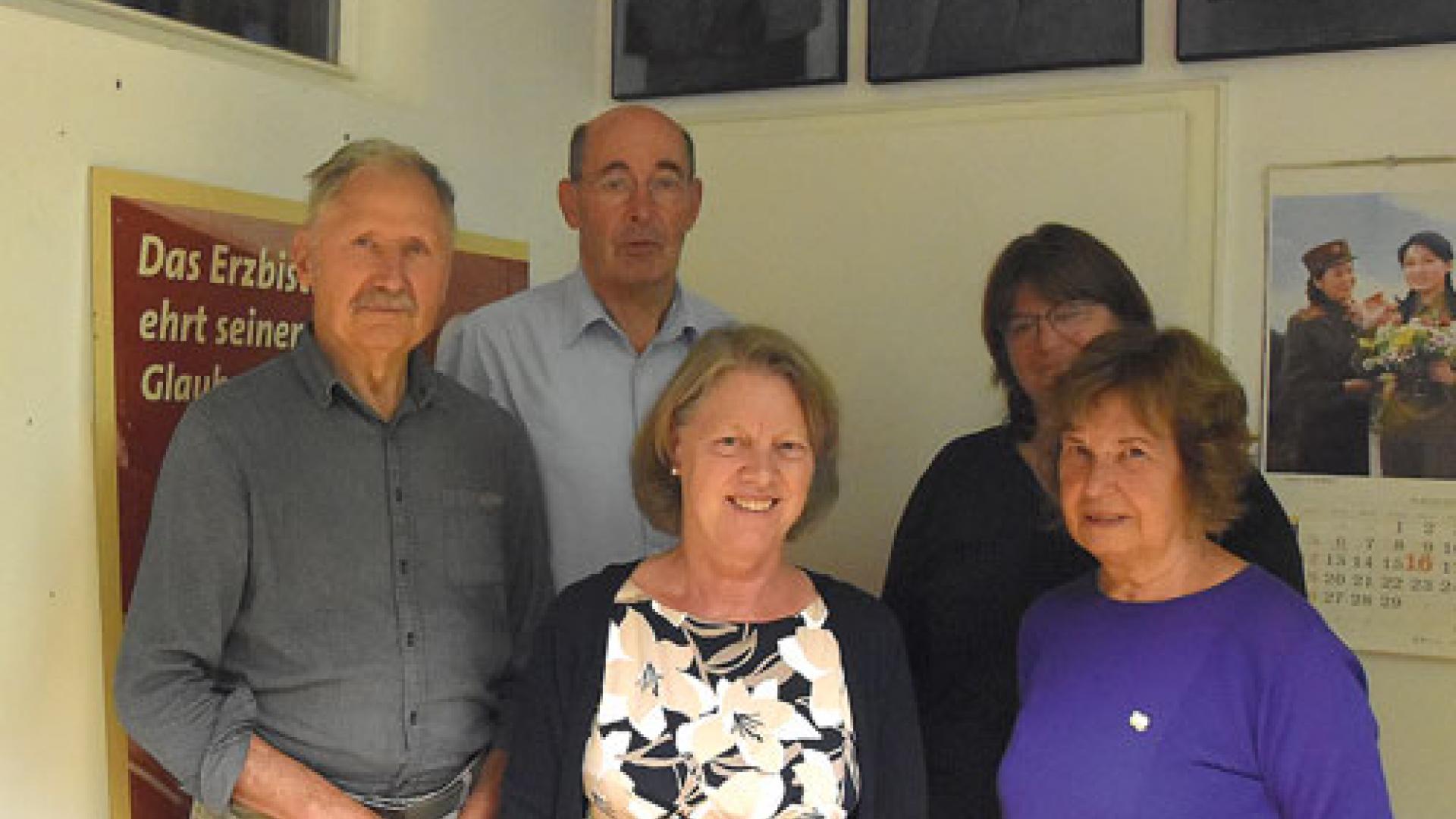 | Werner Sygnecki, Rita Römer-Moch, Monika Hagen (vorne) und Ehepaar Vogt im Vereinszimmer des Berliner Freundeskreises Dr. Erich Klausener. Foto: Dorothee Wanzek |