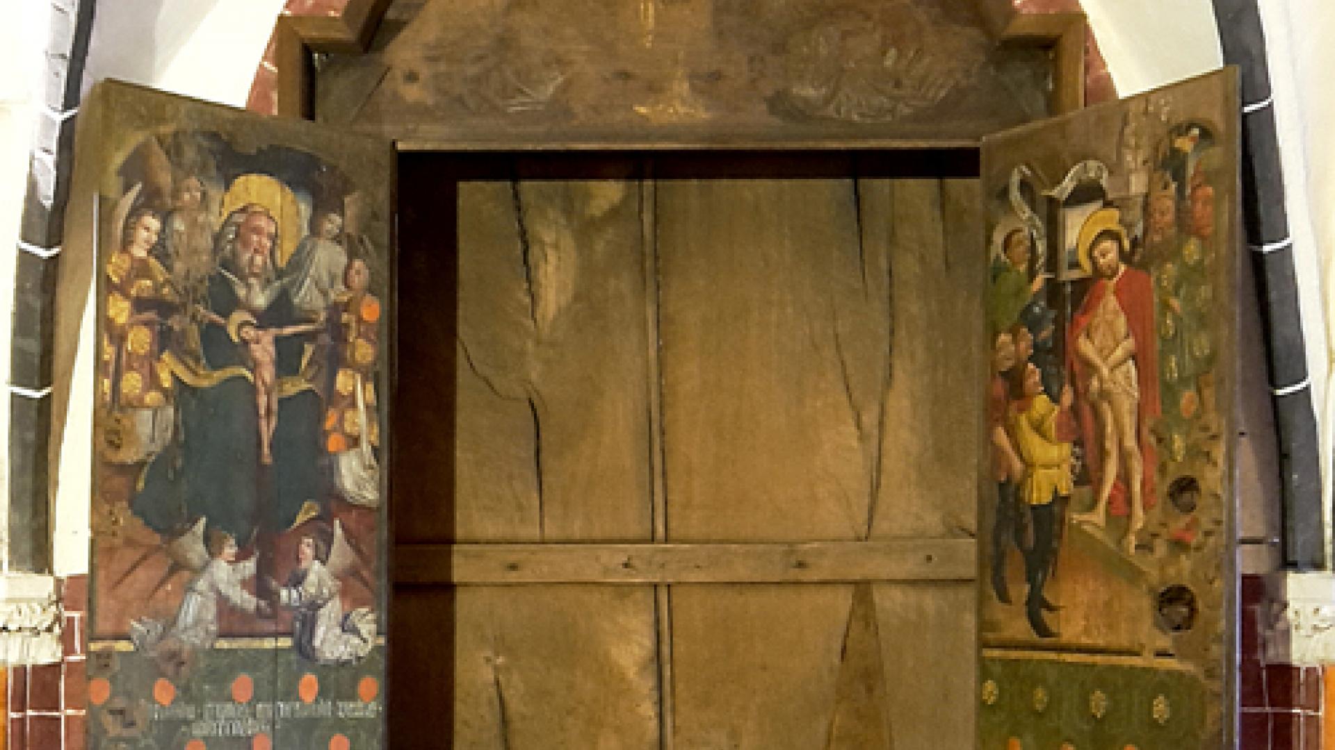 Der geöffnete Schrein in der Wilsnacker Wunderblutkapelle mit seinen beidseitig bemalten Türen. Auf der linken Innenseite ist die heilige Dreifaltigkeit, auf der rechten Jesus Christus nach Verhör und Folter durch Pilatus („Ecce-homo“) abgebildet. Foto: Wikimedia/Andreas Franzowiak |