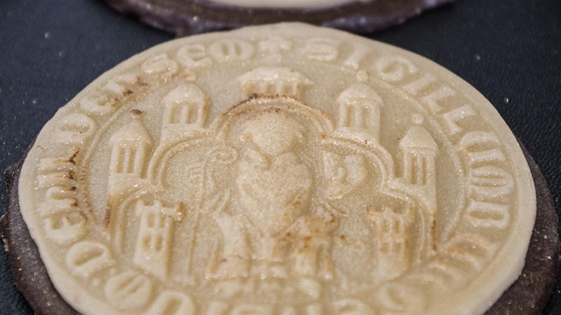 Bei einer zweiten Variante verwendet der Bäckermeister statt der Vollmilchschokolade Marzipan. „Das wird hinterher ein bisschen abgeflammt, damit die Struktur des Siegels besser herauskommt“, beschreibt Höweling. Ob beide Versionen auf den Markt kommen oder nur die Schokovariante, da ist Höweling noch am Überlegen. Nach dem Verkosten sage ich: „Bitte beide!“