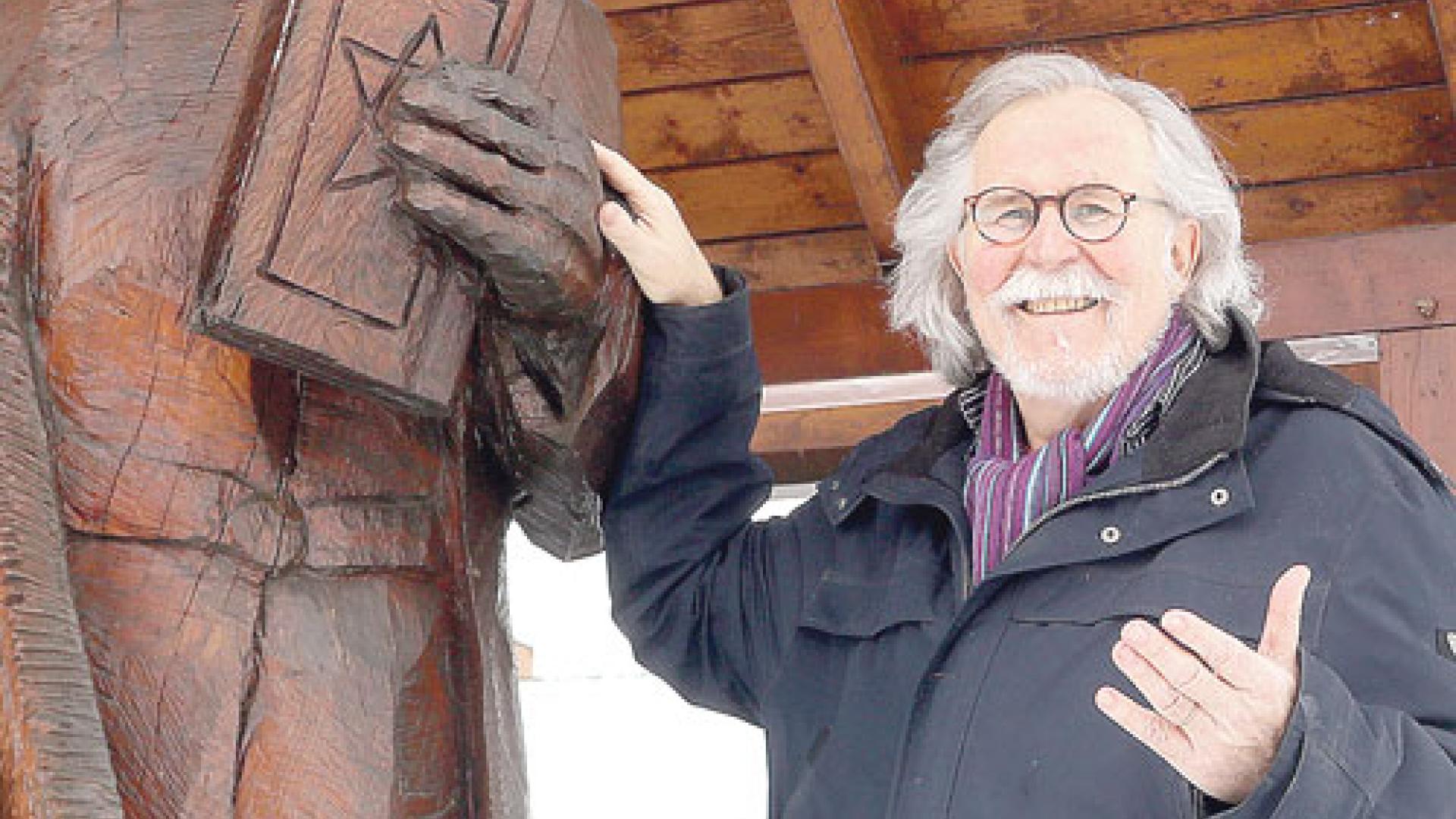 | Wolfgang Kraus mit der Krabat-Figur von Groß Särchen. Foto: Andreas Kirschke |