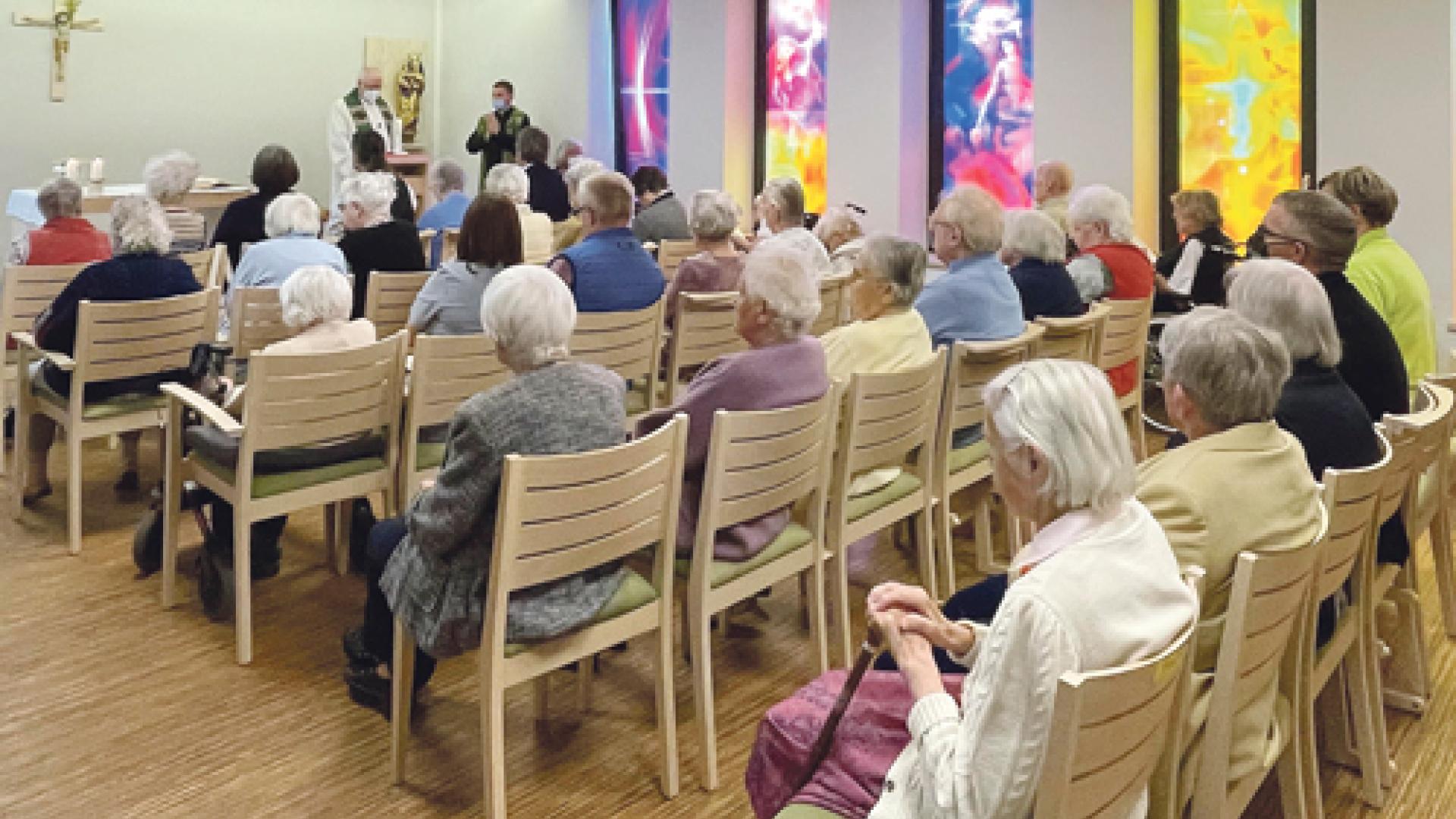 Pfarrer Heiner Waldmann, der in dem Altenpflegezentrum lebt, segnete im Gottesdienst die neuen Fenster. Bei der Einweihung dabei waren auch Diözesan-Caritasdirektorin Monika Funk als Vertreterin für die Lucius-Hebel-Stifung und der Geschäftsführer der Caritas Trägergesellschaft „St. Elisabeth“, Gundekar Fürsich. Er dankte in seiner Ansprache vor allem der Lucius-Hebel-Stiftung für die finanzielle Unterstützung, ohne die eine Anschaffung der Kapellenfenster nicht möglich gewesen wäre.